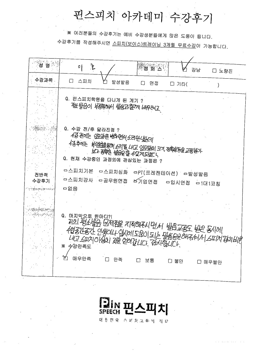 복식호흡을 통한 소리를 낼 수 있게 되었고 발음 교정이 되었습니다.