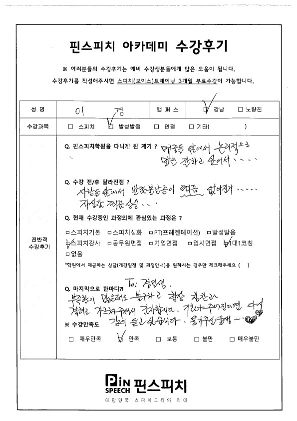 대중 앞에서 논리적으로 말하고 싶어서 수강하게 되었습니다.