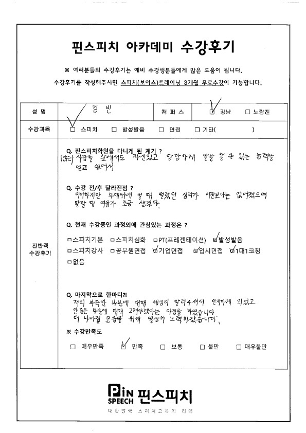 무대 위에서 스피치할 때 떨렸던 심리가 줄고 여유가 생겼습니다.