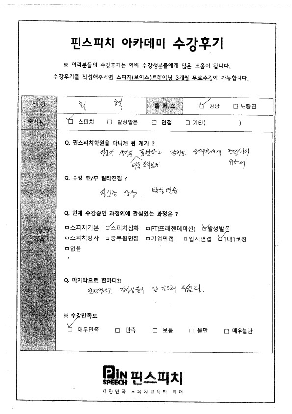 발성 연습으로 스피치에 대한 자신감이 상승했습니다.