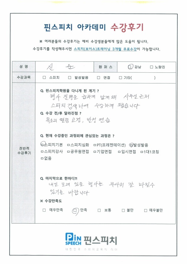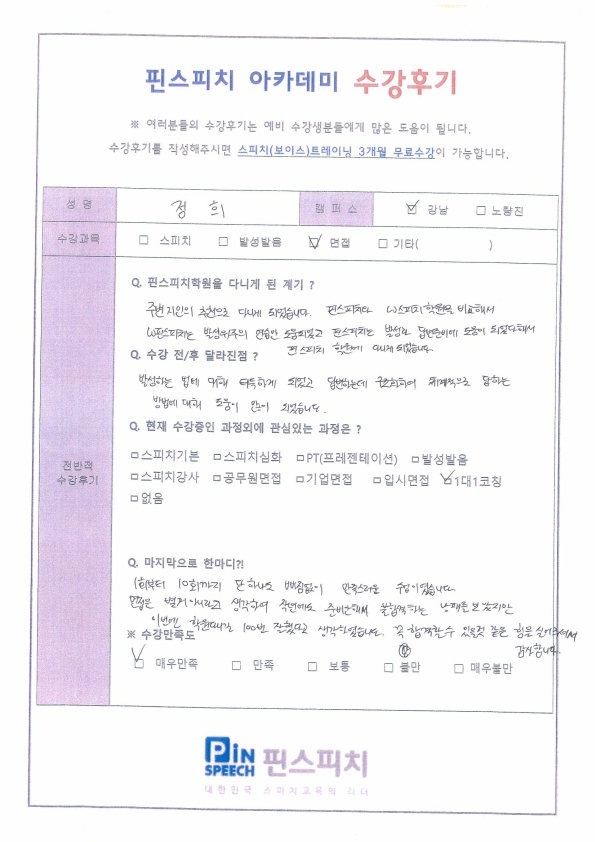지인 추천으로 다니게 되었습니다. 발성부터 면접답변의 구조화까지 도움을 받을 수 있었습니다!