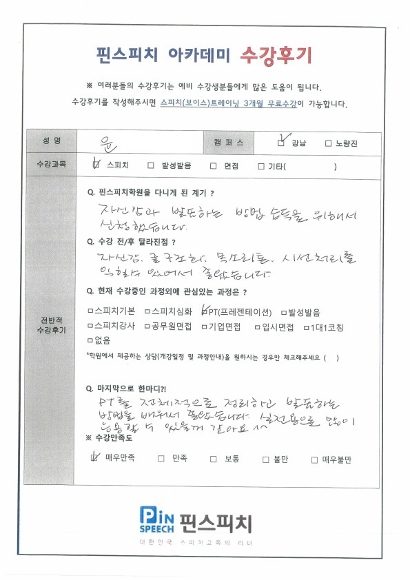 자신감, 글 구조화, 목소리톤, 시선처리를 익힐 수 있어서 좋았습니다.