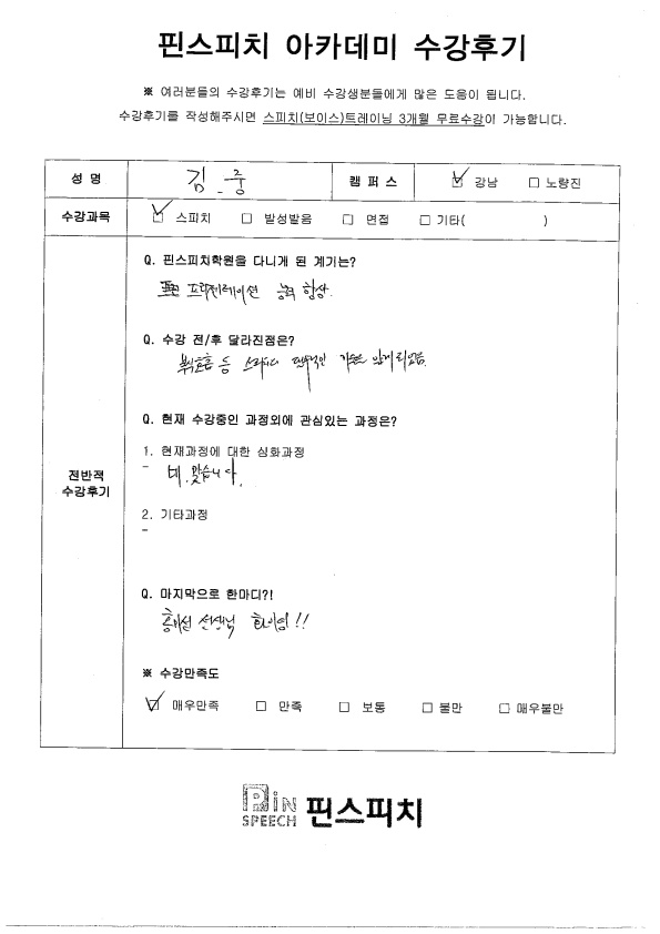 복식호흡 등 스피치의 필수적인 기술을 알게 되었음