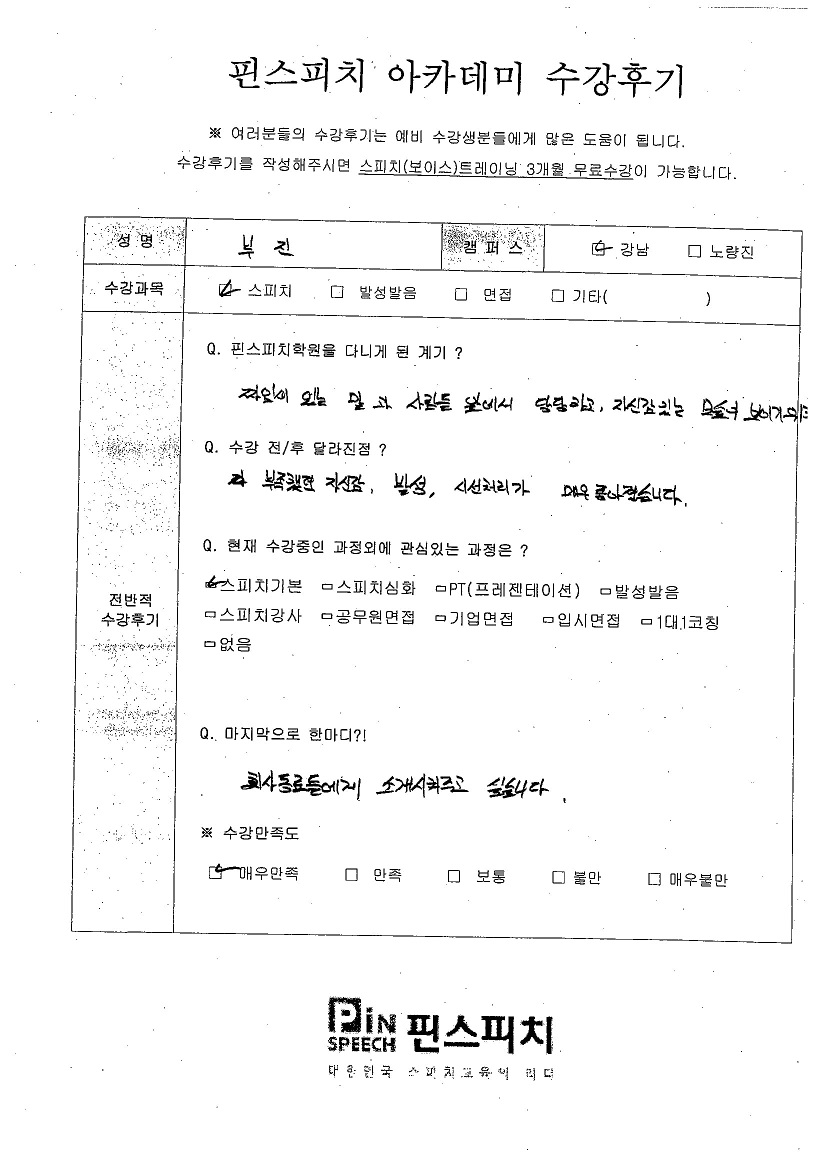 자신감, 발성, 시선처리가 불안했는데 매우 좋아졌습니다.