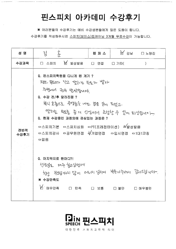 복식호흡으로 공명음을 내는 법을 알게 되었고, 말하는 속도를 조절할 수 있게 되었습니다.